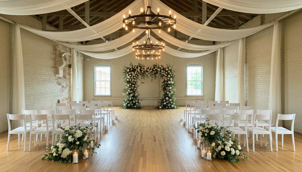 Located in the historic Carriage Barn on the Old Bag Factory premises, the building is saturated with character. Featuring it’s original hardwood floors that tell all the stories from moments in history that give the planks their charm. It’s soaring vaulted ceilings accented by twinkling lights and cascading white fabrics create an atmosphere of warm, sophisticated elegance.